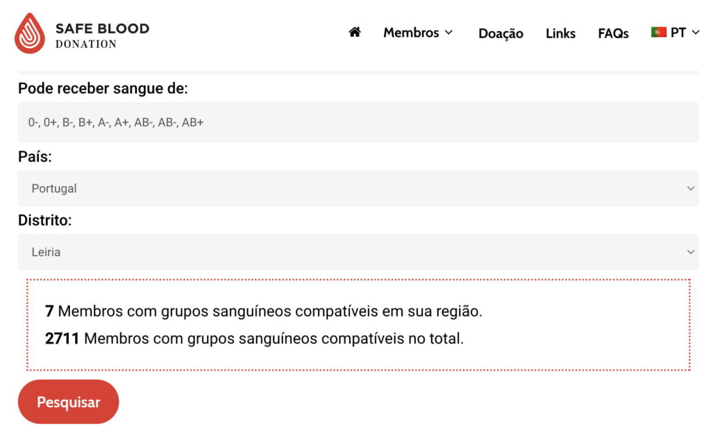 Mais informações sobre os tipos de sangue dos nossos membros e sobre a compatibilidade dos tipos de sangue em geral podem ser encontradas aqui: https://safeblood.pt/pt-pt/diagrama-de-grupos-de-sangue/