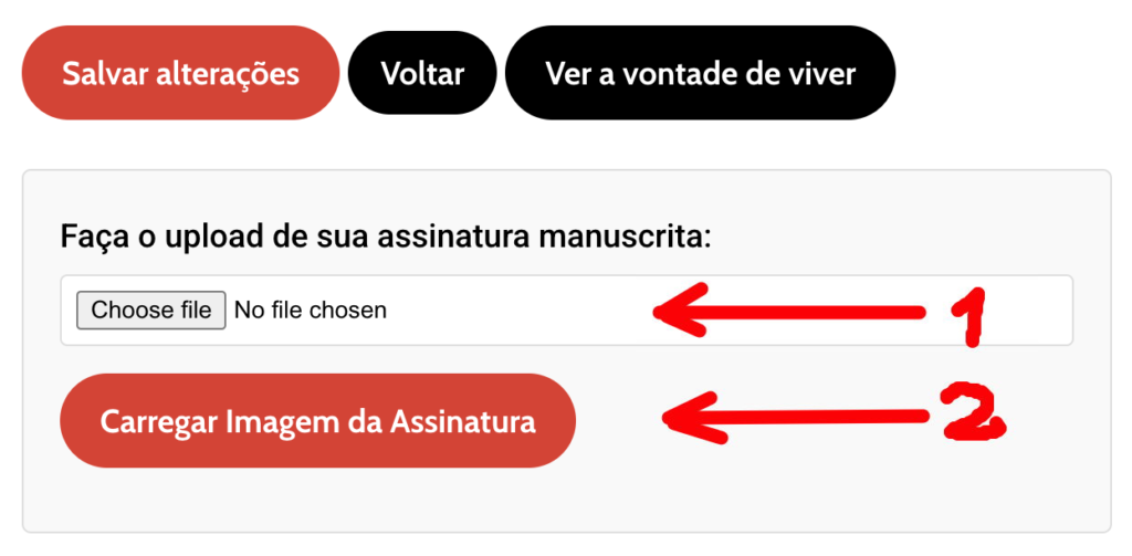 Depois de ter guardado as alterações, pode carregar uma assinatura digitalizada. Para tal, selecione o ficheiro que contém a sua assinatura (1, Choose file) e clique em “Carregar Imagem da Assinatura (2)”.